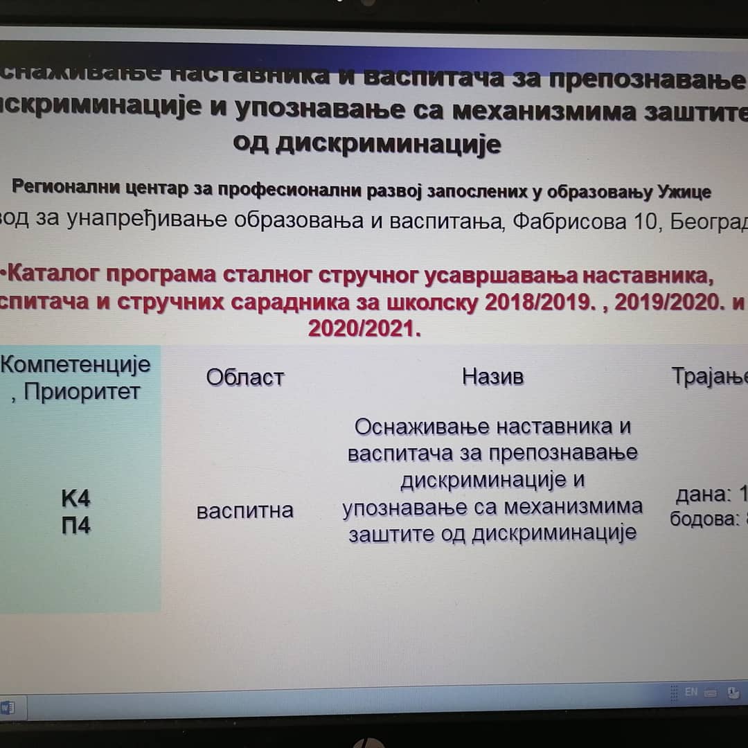 9.октобра, одржан је семинар Оснаживање наставника и васпитача за препознавање дискриминације и упознавање са механизмима заштите од дискриминације за наставнике из Средње школе Свети Ахилије из Ариља. Семинар је реализован онлине путем ЗООМ апликације. Ауторке и реализаторке семинара:Милена Вићевић, професорка разредне наставе, Гордана Савић, Ужички центар за људска права и демократију. Модераторка семинара и наша ИКТ подршка : Јелица Стевановић, професорка рачунарства и информатике.