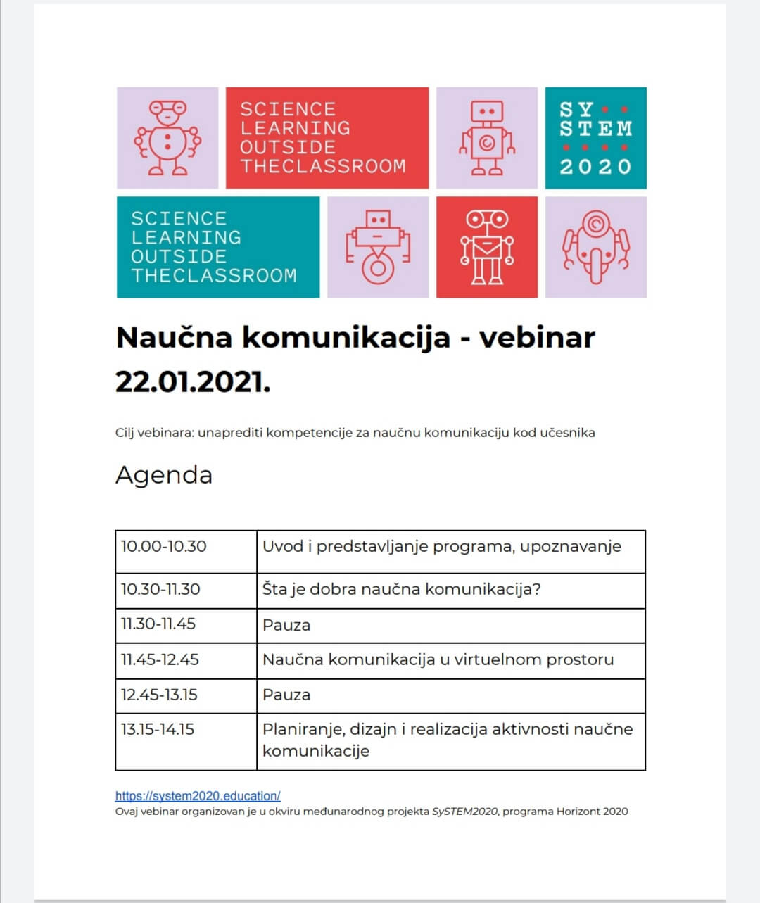 22. јануара, реализован је вебинар о научној комуникацији који је организовао Центар за промоцију науке за Научне клубове широм Србије. Учеснице вебинара испред Научног клуба РЦУ биле су: Ивана Јовановић и Јована Васић, истраживачи за унапређење образовања РЦУ.