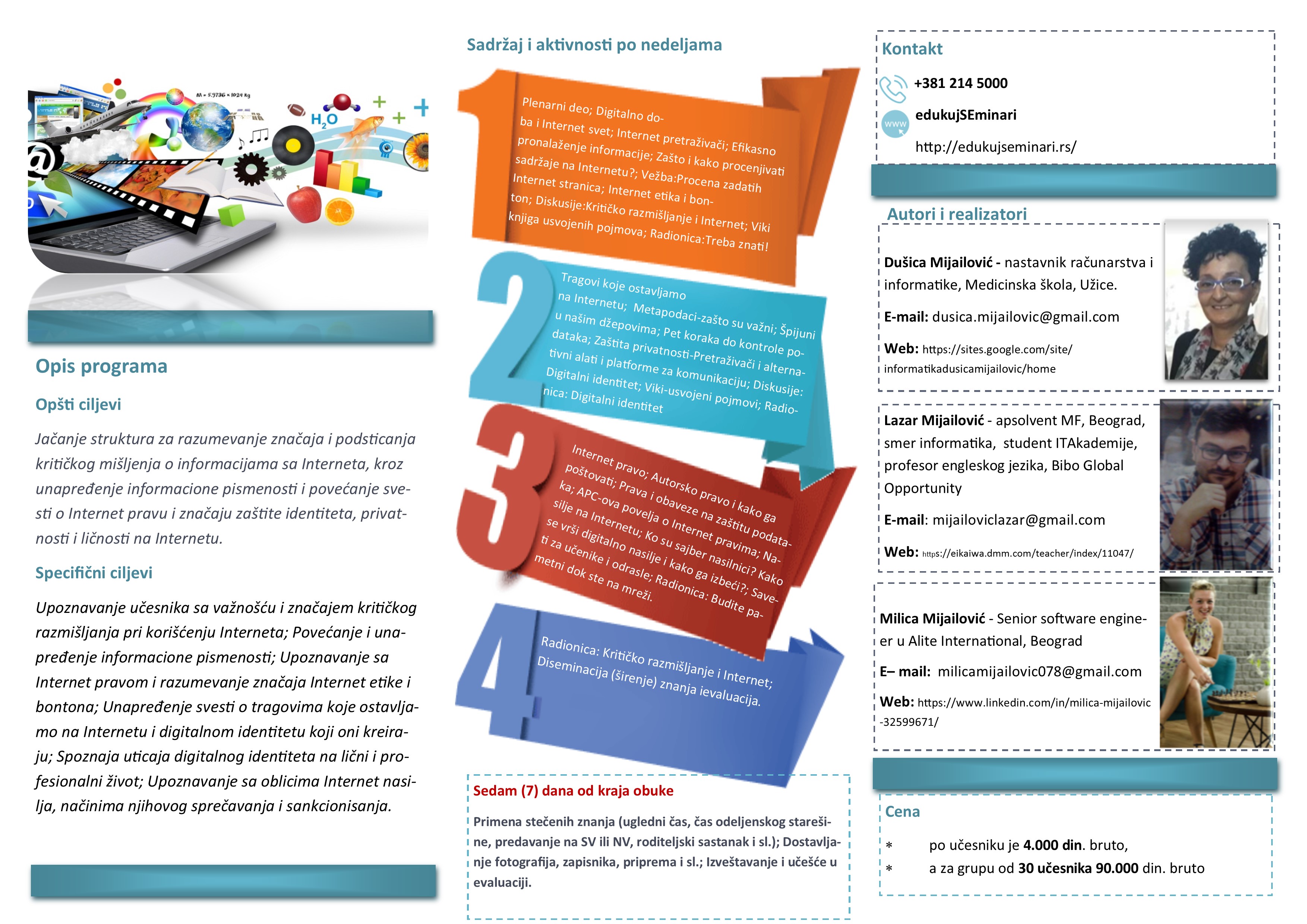 Аутори семинара: Душица Мијаиловић, дипломирани инжењер , Медицинска школа Ужице; Милица Мијаиловић, информатичар , sTech d.o.o. Belgrade члан UNIQA Group Austria ; Лазар Мијаиловић, апсолвент - Математички факултет БУ, Bibo Global Opportunity Inc. Manila, Philippines;