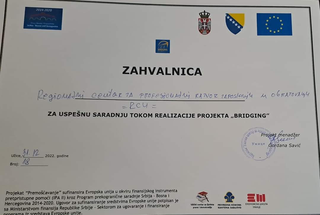 РЦУ додељена захвалница за успешну сарадњу током реализације пројекта "Премошћавање"