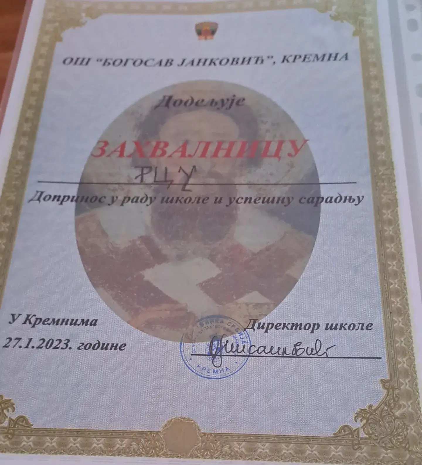 Поводом школсе славе Савиндан, ОШ "Богосав Јанковић", Кремна , директорка школе Оливера Мисаиловић, доделила је РЦУ захвалницу за допринос у раду школе и успешну сарадњу.